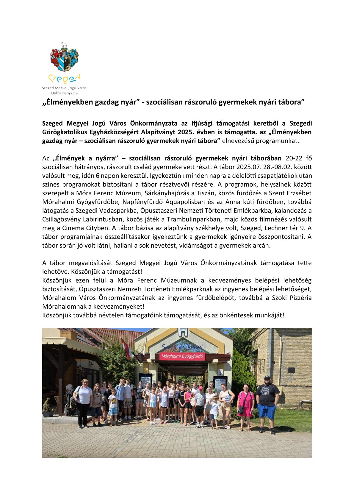 Szeged Megyei Jogú Város Önkormányzata a Szegedi Görögkatolikus Egyházközségért Alapítványt az Ifjúsági támogatási keretből 2024. támogatta. E támogatás eredményeként 2024. júliusában a már hagyományosnak tekinthető napközis nyári táborunk valósult meg.